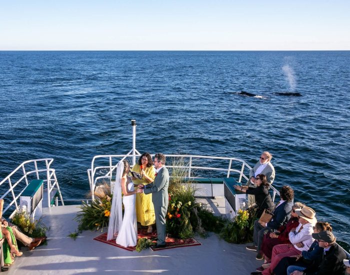Weddings with 7 Seas Whale Watch aboard the Privateer IV are the perfect for couples who want something truly special and unique. Departing from Gloucester, this is not just a venue, it’s an unforgettable celebration at sea. Exchange vows on the open ocean surrounded by sweeping views and golden sunset light. With space for up to 150 guests, your entire event flows effortlessly from ceremony to reception, with catering, music, and dancing all in one extraordinary setting. It’s intimate, breathtaking, and completely one of a kind!