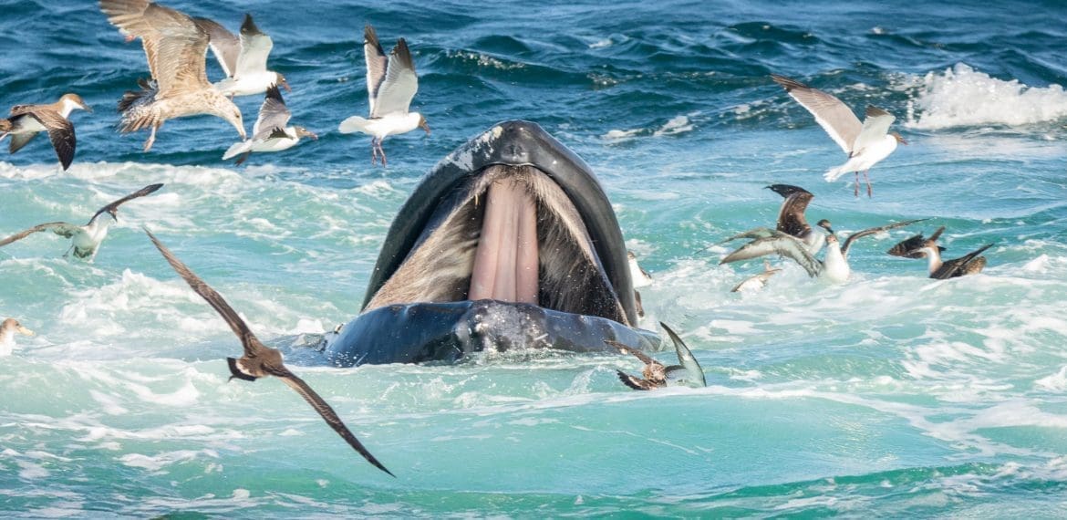 The shape of the seafloor at Stellwagen Bank directs ocean currents in ways that bring nutrient-rich waters from the depths to the surface. Sunlight, oxygen, and nutrients combine to fuel massive annual plankton blooms. This microscopic life forms the base of the food chain, supporting fish, birds, seals, and, of course, the whales that make Stellwagen Bank famous.