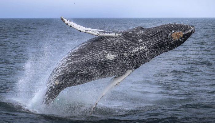 This is when Humpback Whales (or occasionally other whale species) lay on their sides or backs at the surface and raise one or both of their pectoral fins in the air. Humpbacks have unusually long side flippers (~15 feet long) which led to their being given the scientific name “Megaptera novaeangliae” or “Big-winged New Englander”. Humpbacks often repeatedly strike the water’s surface with their flippers which produced a loud slapping sound that can be heard a great distance both above and below the water.